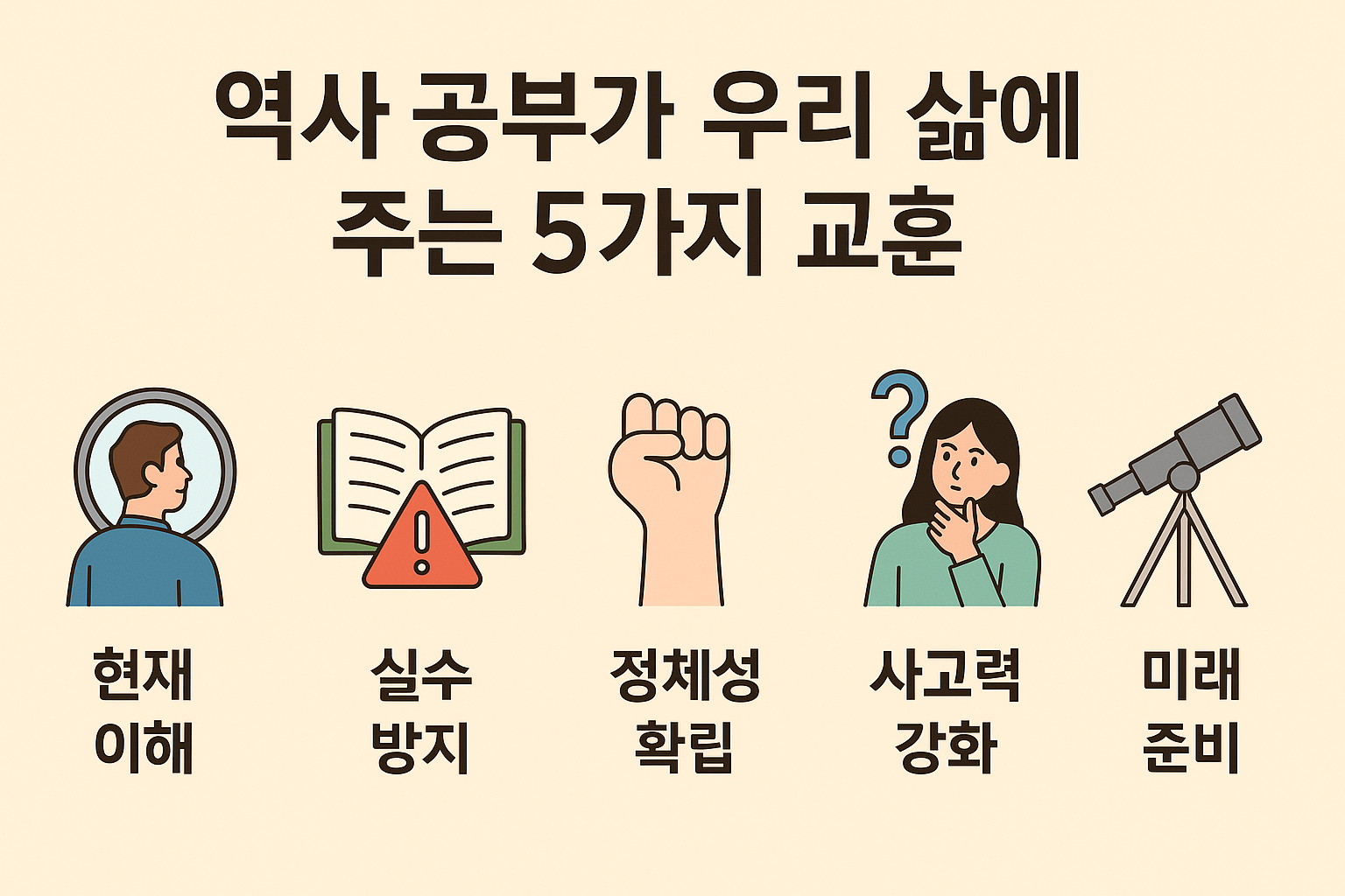 역사 공부가 우리 삶에 주는 5가지 교훈. 현재 이해, 실수 방지, 정체성 확립, 비판적 사고, 미래 준비라는 역사 교육의 가치를 정리했습니다. 한능검 대비 필수.